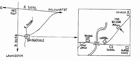 From Holsworthy take the road to Bude (A 3072). You will pass Rydon Park, then the Golf Club on the left. After the golf club there are a couple of bends in the road before you reach a left turn signed to Bridgerule. Turn left here and drive for three miles. As you enter the village of Bridgerule, you will pass the church on your right. Drive down the hill (take care as the road is very narrow). The mill is on the right at the bottom of the hill opposite “Short and Abbot” agricultural engineers.